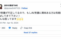 AV男优 严重不足!著名的AV男优 漫画家、也是事务所アルヴィロッソ(Alvirosso)的代表「赤井さん」是在自己的X(https://twitter.com/akaiakaisan)揭露了这个状况,请注意喔,他是用「空前不足」来形容目前AV男优短缺的困境,然后他拜托有兴趣当AV男优的30公分们赶快私讯,「也许你就是AV界救世主」: