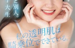 又是一台战斗机器!为什么这么说?让我们一块儿看看这位在片商kawaii*出道的新人「真白さら(真白沙罗)」,封面很直接地说了她的三大优点:首先是「极细女子大生」,这意思是她瘦个像根竹竿,很适合喜欢排骨精的朋友服用,尤其是那不输伊藤舞雪的细腰应该会让人想按住她冲击小穴三千下;再来就是中间的「透明肌」,这意思是她皮肤好的不得了,已经不是超级掰的超级白,而是白到有点到半透明了,对笃信一白遮三丑的朋友这真是让人鸡动啊〜